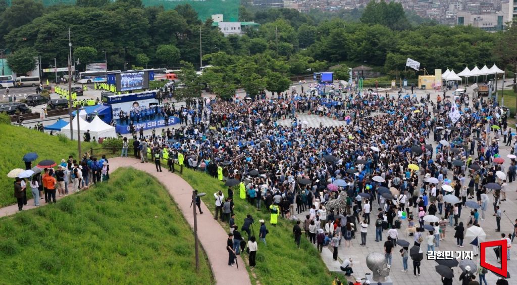 제21대 대통령 선거를 하루 앞둔 2일 서울 강북구 북서울꿈의숲 서문광장에서 열린 이재명 더불어민주당 대선 후보의 유세를 많은 시민들이 지켜보고 있다.