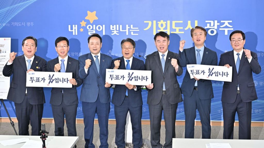 강기정 광주시장과 이정선 광주시교육감, 임택 동구청장, 김이강 서구청장, 김병내 남구청장, 문인 북구청장, 박병규 광산구청장이 2일 오전 시청 브리핑룸에서 기자회견을 갖고, 제21대 대통령 선거 투표 참여를 호소하고 있다. 광주 서구청 제공