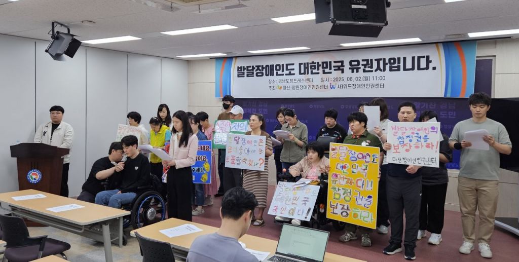 마산·창원장애인인권센터와 사단법인 위드장애인인권센터는 2일 경남도청 프레스센터에서 기자회견을 열고 "발달장애인도 대한민국 유권자인데 투표할 수 없었다"고 주장했다.
