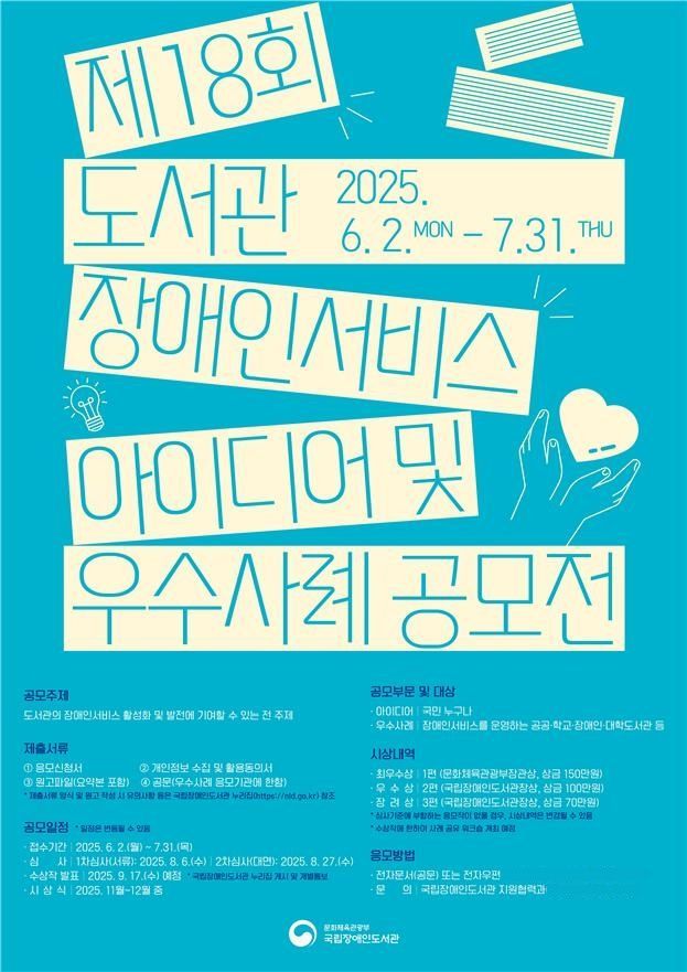 문화체육관광부 국립장애인도서관은 다음 달 31일까지 전국 도서관의 장애인서비스 발전과 장애인의 정보격차 해소에 기여할 수 있는 '도서관 장애인서비스 아이디어 및 우수사례'를 공모한다고 2일 밝혔다.