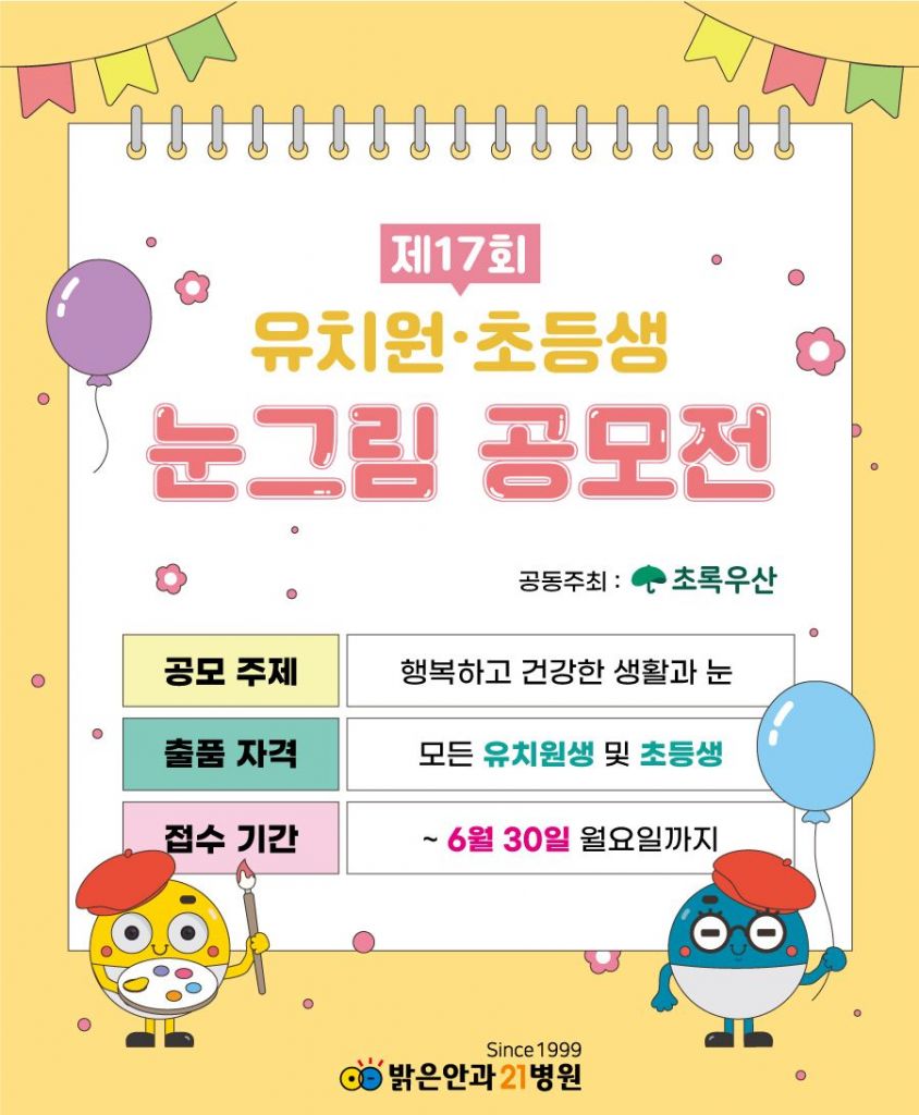 밝은안과21병원은 초록우산 광주지역본부와 '제17회 어린이 눈그림 공모전'을 개최한다고 2일 밝혔다.