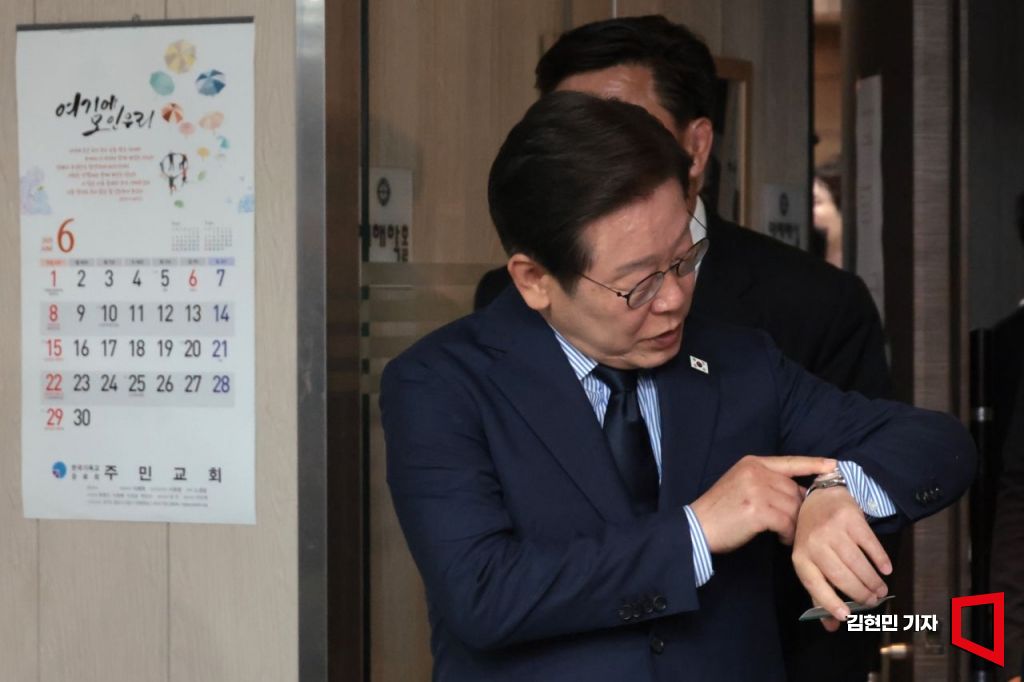 이재명 더불어민주당 대선 후보가 2일 경기 성남시 수정구 성남주민교회에서 열린 기자회견을 마친 뒤 이동하며 시간을 확인하고 있다.