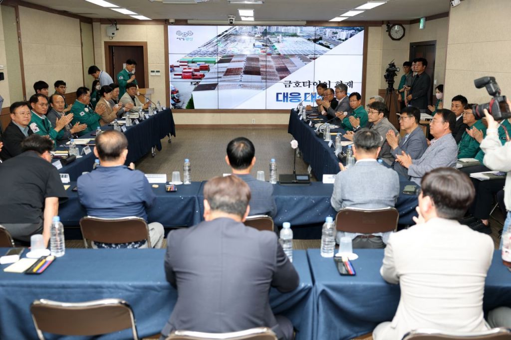 광주 광산구는 2일 구청 상황실에서 금호타이어 광주공장 화재 대응을 위한 대책 회의를 열었다. 회의에는 박병규 구청장, 김명수 광산구의회 의장, 성용태 금호타이어 노사협력상무, 황경순 금호타이어 노조위원장 등 노사민정 대표 20여 명이 참석했다.