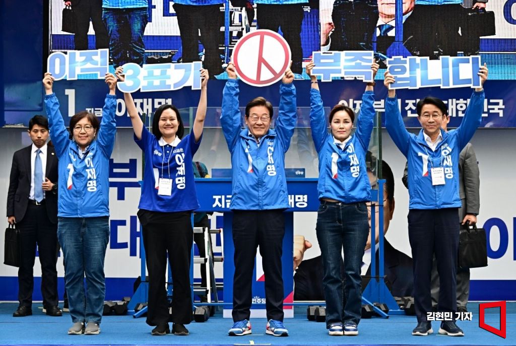 이재명 더불어민주당 대선 후보가 2일 경기 광명시 철산로데오 광장에서 열린 유세에 참석해 투표 독려 퍼포먼스를 선보이고 있다.