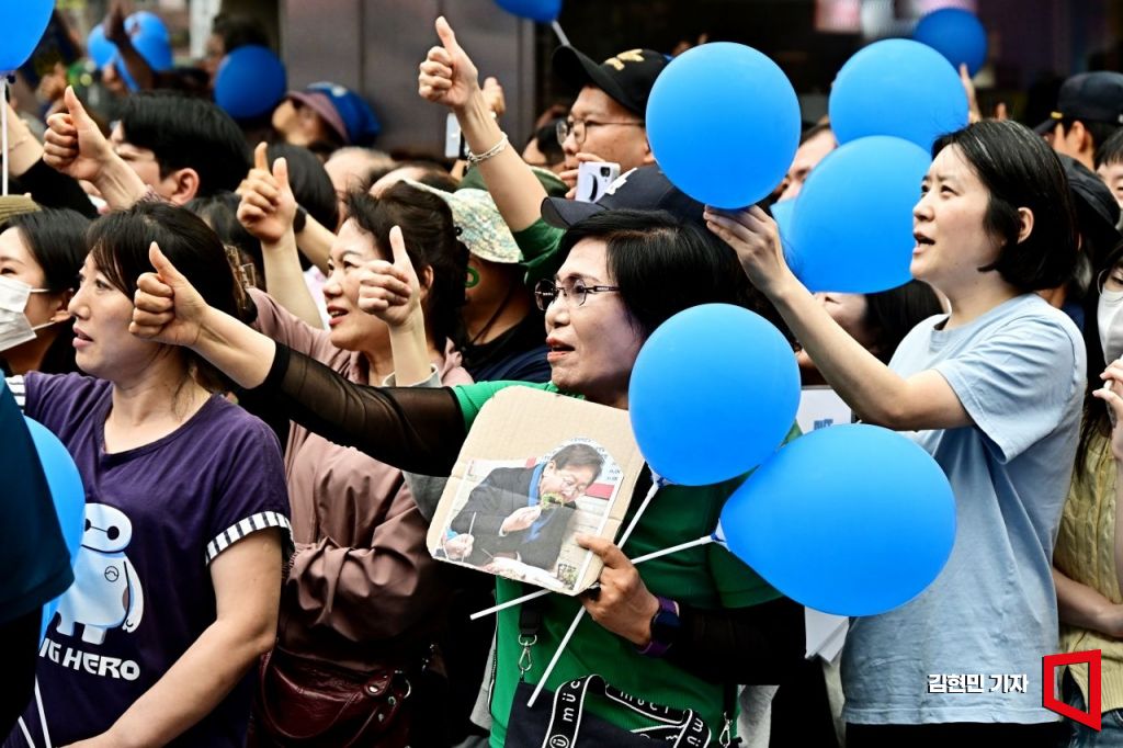 2일 경기 광명시 철산로데오 광장에서 시민들이 이재명 더불어민주당 대선 후보의 유세를 지켜보며 환호하고 있다.