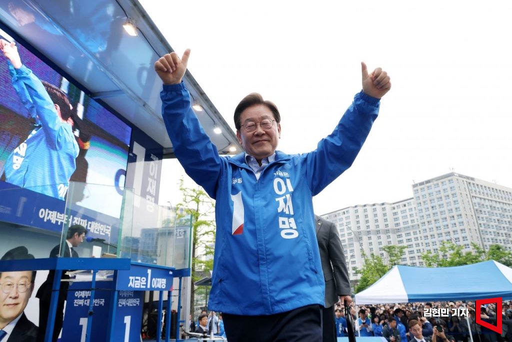 이재명 더불어민주당 대선 후보가 2일 서울 강서구 서울식물원 마곡나루광장에서 열린 강서구·양천구 유세에서 지지를 호소하고 있다.