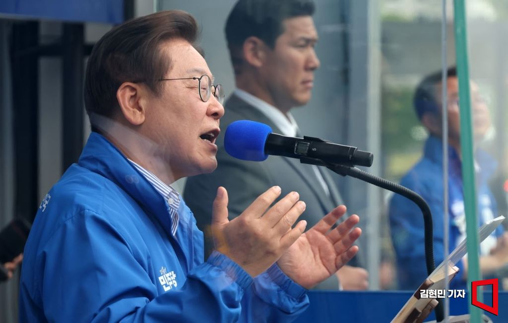 이재명 더불어민주당 대선 후보가 2일 서울 강서구 서울식물원 마곡나루광장에서 열린 강서구·양천구 유세에서 지지를 호소하고 있다.