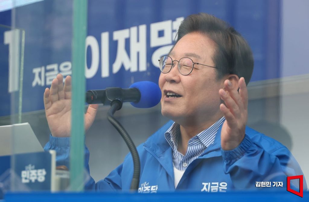 이재명 더불어민주당 대선 후보가 2일 서울 강서구 서울식물원 마곡나루광장에서 열린 강서구·양천구 유세에서 지지를 호소하고 있다.