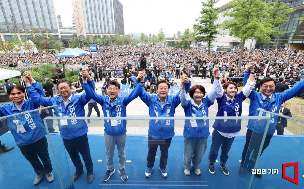 이재명 더불어민주당 대선 후보가 2일 서울 강서구 서울식물원 마곡나루광장에서 열린 강서구·양천구 유세에서 지지를 호소하고 있다.