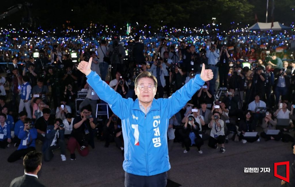 이재명 더불어민주당 대선 후보가 선거를 하루 앞둔 2일 서울 여의도공원 마지막 유세장에 도착해 두 팔을 들어 인사하고 있다.