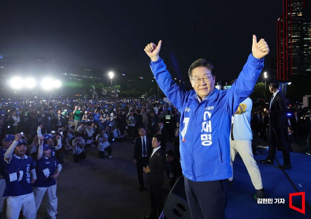 이재명 더불어민주당 대선 후보가 2일 서울 여의도공원 문화의마당에서 열린 마지막 유세에서 시민들에게 지지를 호소하고 있다.