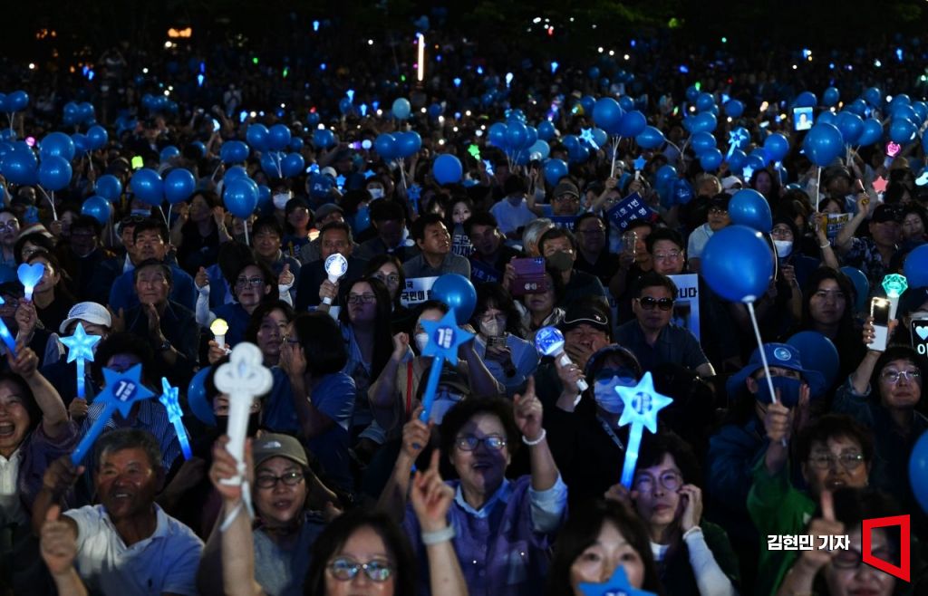대통령 선거를 하루 앞둔 2일 서울 여의도공원 문화의마당에서 열린 이재명 더불어민주당 대선 후보의 유세에서 시민들이 응원봉을 들고 환호하고 있다.