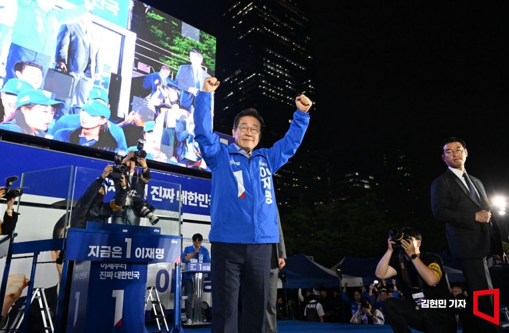 이재명 더불어민주당 대선 후보가 2일 서울 여의도공원 문화의마당에서 열린 마지막 유세에서 지지를 호소하고 있다. 김현민 기자