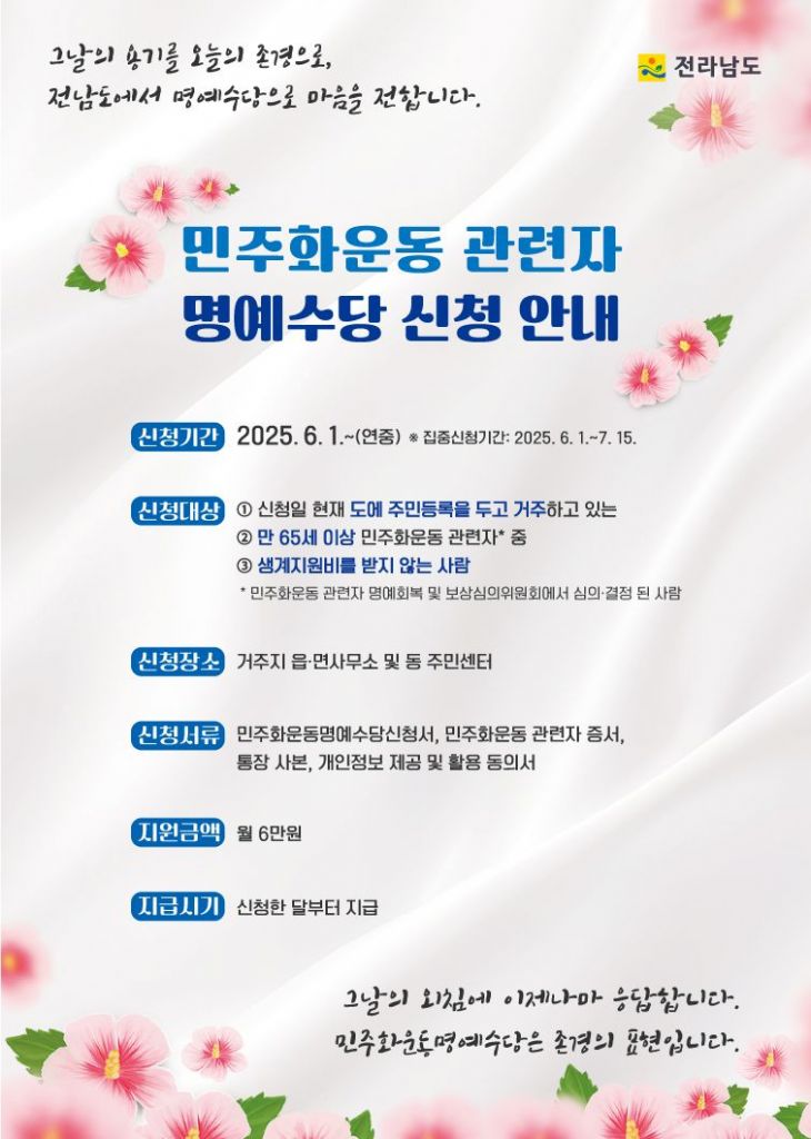 심재명 전남도 자치행정과장은 "민주화운동명예수당은 민주주의와 인권을 위해 헌신한 분들의 용기에 대한 감사와 존경의 상징이다."며 "늦었지만, 꼭 필요한 예우인 만큼 대상자들께서 빠짐없이 신청하길 바란다"고 당부했다.
