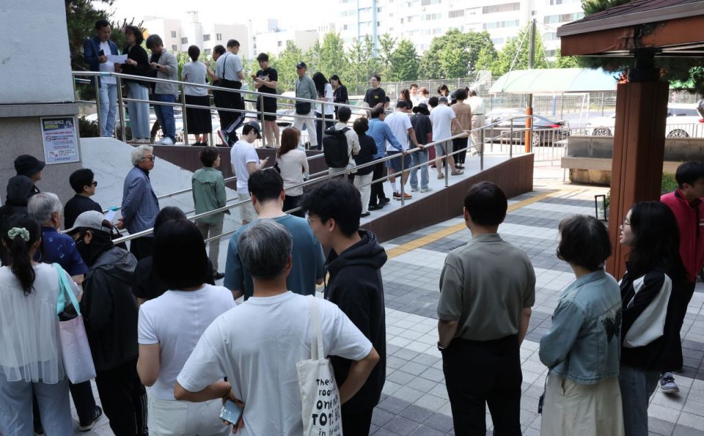 제21대 대통령선거일인 3일 서울 영등포구 여의도중학교에 마련된 여의도제4투표소에서 시민들이 투표를 위해 줄 서 있다. 연합뉴스