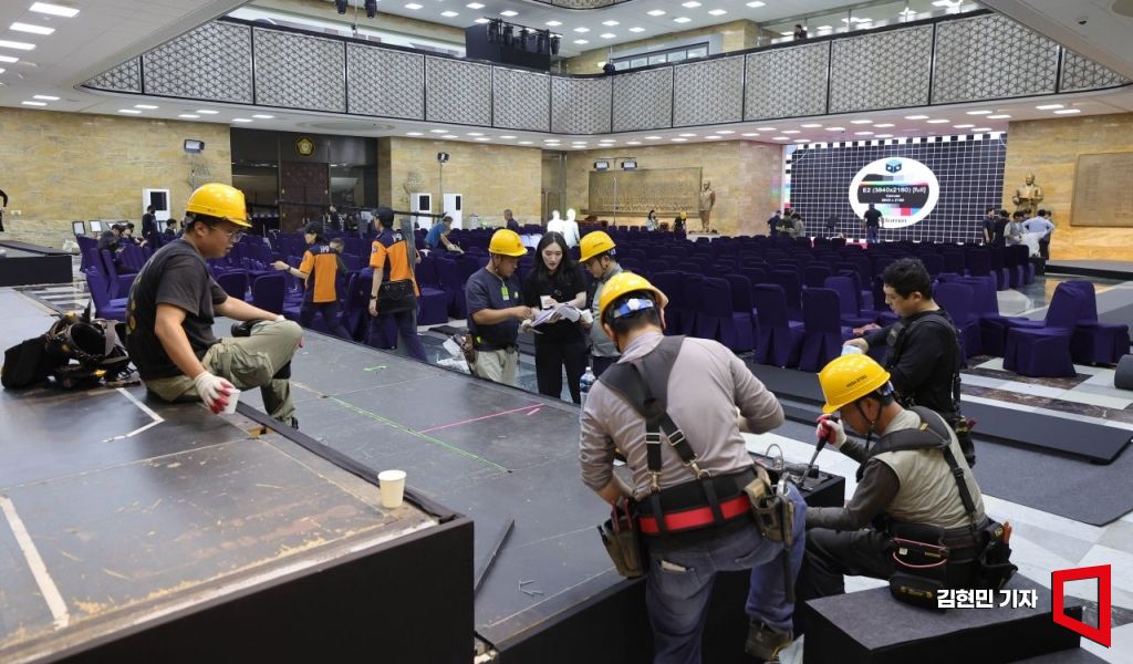제21대 대통령 취임식을 하루 앞둔 3일 국회 로텐더홀에서 행사 관계자들이 취임식을 준비하고 있다.