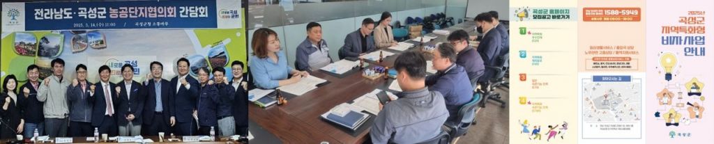 (사진 왼쪽부터) 전라남도-곡성군 농공단지협의회 간담회, 농공단지 내 입주기업 방문 지역특화형 비자 사업 홍보, 지역특화형 비자 사업 홍보 리플릿. 곡성군 제공