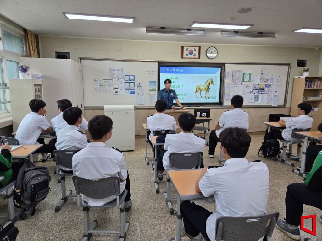 교육은 총 1학년 10개 학급을 두 반씩 묶어 5개 교실에서 동시 진행됐으며, 각 교실에는 학교전담경찰관(SPO) 5명이 직접 들어가 '학생 눈높이'에 맞춘 밀도 높은 맞춤형 강의를 펼쳤다.