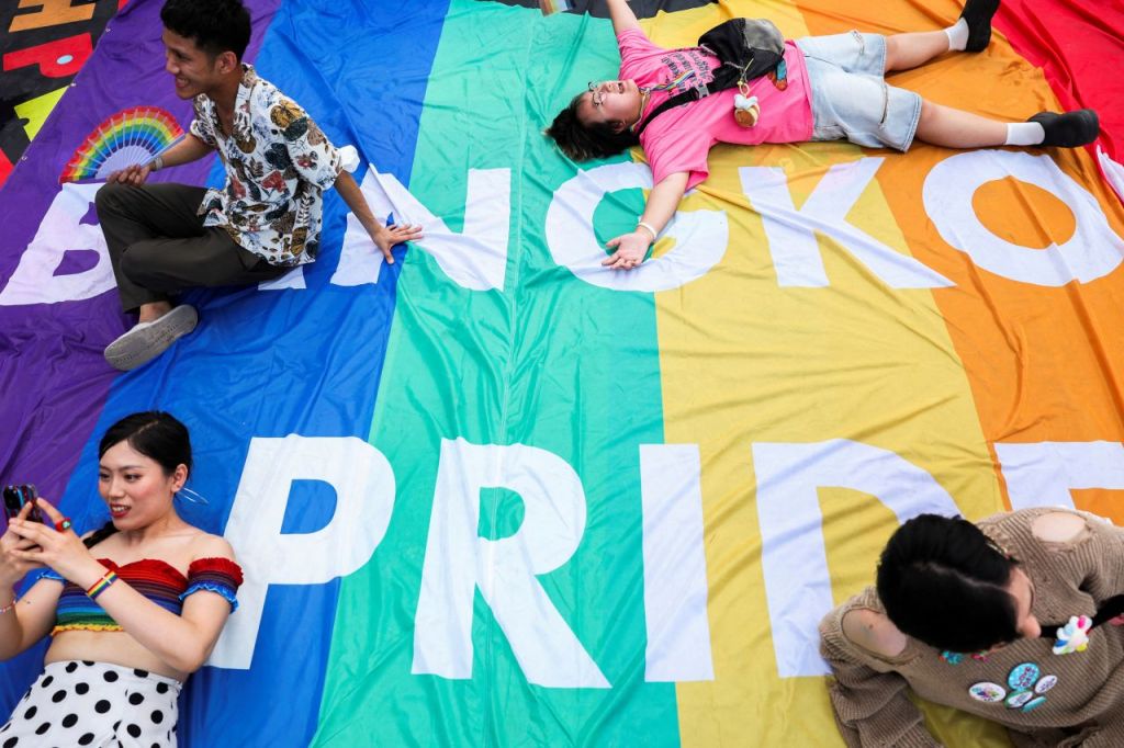 지난 1일(현지시간) 태국 방콕에서 열린 성소수자 행진에 참가한 사람들이 대형 무지개 깃발에서 포즈를 취하고 있다. 로이터 연합뉴스
