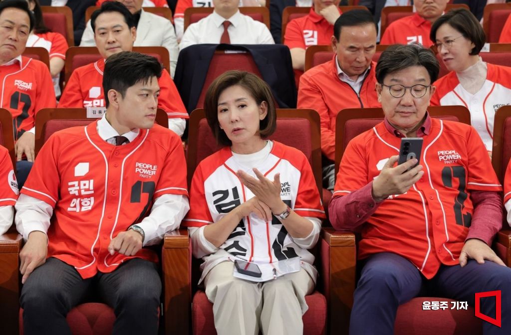 김용태 국민의힘 비상대책위원장과 나경원 공동선대위원장이 3일 국회 도서관에 마련된 제21대 대통령선거 국민의힘 개표상황실에서 출구 조사 결과를 지켜보며 이야기를 나누고 있다.