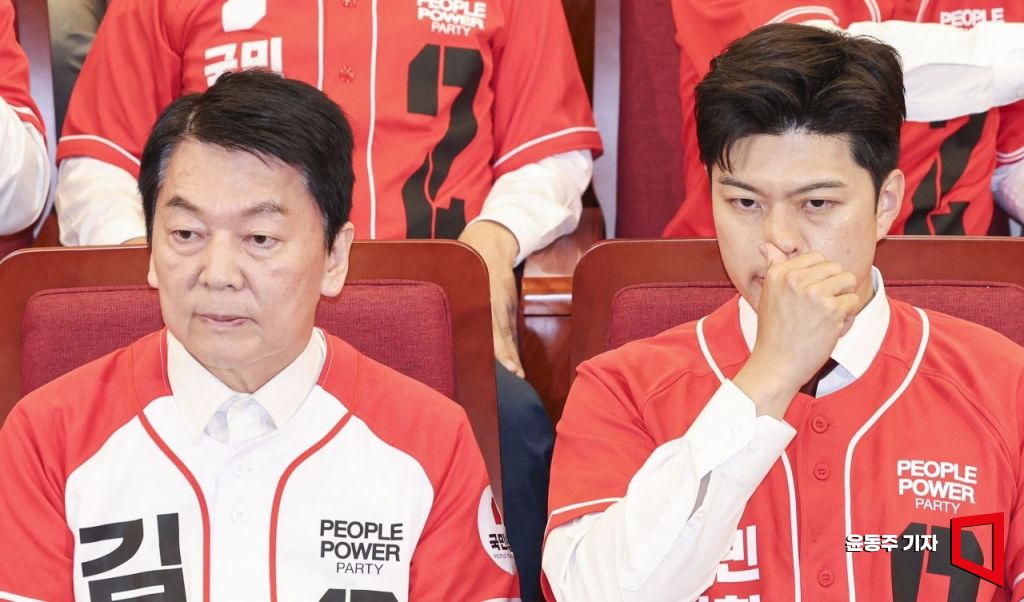 김용태 국민의힘 비상대책위원장과 안철수 공동선대위원장이 3일 국회 도서관에 마련된 제21대 대통령선거 국민의힘 개표상황실에서 출구 조사 결과를 보고 심각한 표정을 짓고 있다.