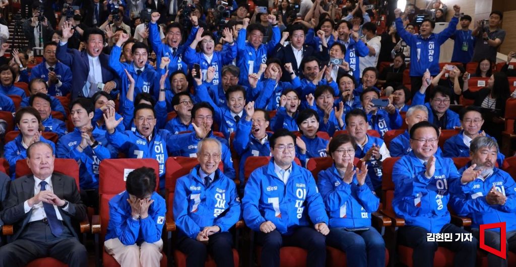 윤여준·박찬대 더불어민주당 상임총괄선대위원장을 비롯한 선대위 관계자들이 3일 국회의원회관 개표상황실에서 제21대 대통령선거 지상파 출구조사 결과에서 이재명 후보가 51.7%로 앞서는 것으로 발표되자 환호하고 있다.