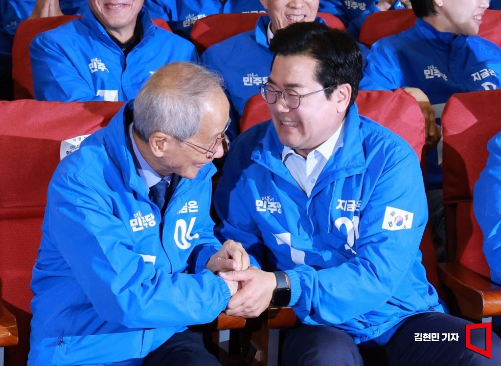 윤여준·박찬대 더불어민주당 상임총괄선대위원장을 비롯한 선대위 관계자들이 3일 국회의원회관 개표상황실에서 제21대 대통령선거 지상파 출구조사 결과에서 이재명 후보가 51.7%로 앞서는 것으로 발표되자 환호하고 있다.