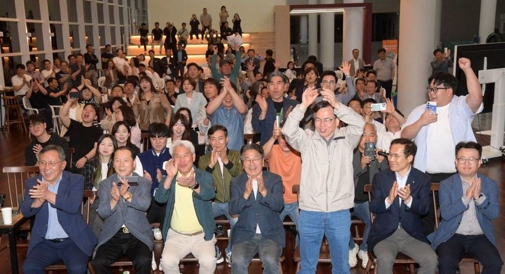 제21대 대통령 선거가 치러진 3일 오후 8시께 광주시청 1층 시민홀에서 강기정 광주시장을 비롯해 공공기관장, 시청 직원, 시민 등이 방송사들의 출구조사에서 이재명 더불어민주당 후보가 승리할 것이라는 예측 결과가 나오자 환호하고 있다. 독자 제공
