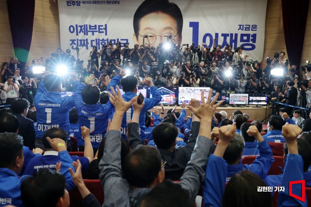 윤여준·박찬대 더불어민주당 상임총괄선대위원장을 비롯한 선대위 관계자들이 3일 국회의원회관 개표상황실에서 제21대 대통령선거 지상파 출구조사 결과에서 이재명 후보가 51.7%로 앞서는 것으로 발표되자 환호하고 있다.