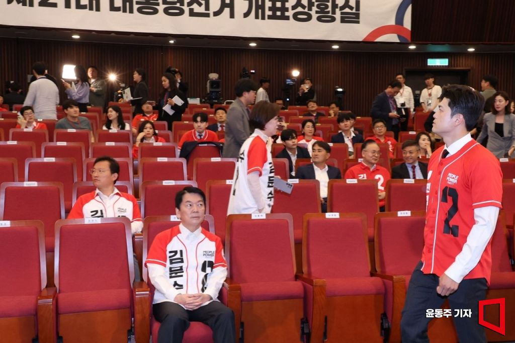 김용태 국민의힘 비상대책위원장이 3일 국회 도서관에 마련된 제21대 대통령선거 국민의힘 개표상황실에서 출구 조사 결과를 지켜본 뒤 상황실을 떠나고 있다.
