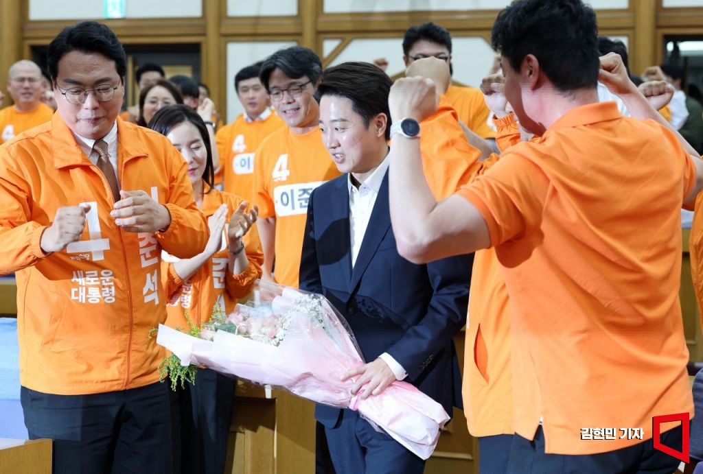 이준석 개혁신당 대선 후보가 3일 방송 3사 출구조사 발표를 확인한 뒤 국회 의원회관에 마련된 당 개표상황실에 도착하고 있다.