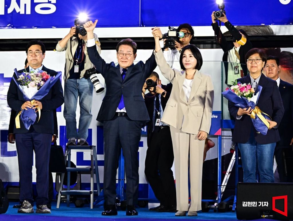 제21대 대통령 당선이 확실시되는 이재명 더불어민주당 대선 후보와 김혜경 여사가 4일 서울 여의도 국회 앞에서 열린 국민 개표방송 행사에서 시민들을 향해 인사하고 있다. 2025.6.4 김현민 기자