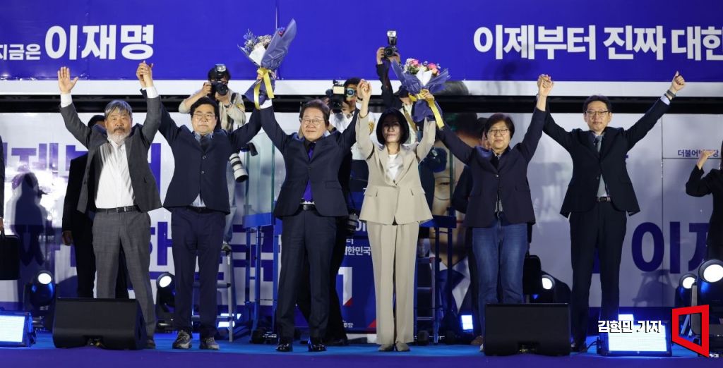 제21대 대통령 당선이 확실시되는 이재명 더불어민주당 대선 후보와 김혜경 여사가 4일 서울 여의도 국회 앞에서 열린 국민 개표방송 행사에서 시민들을 향해 인사하고 있다.