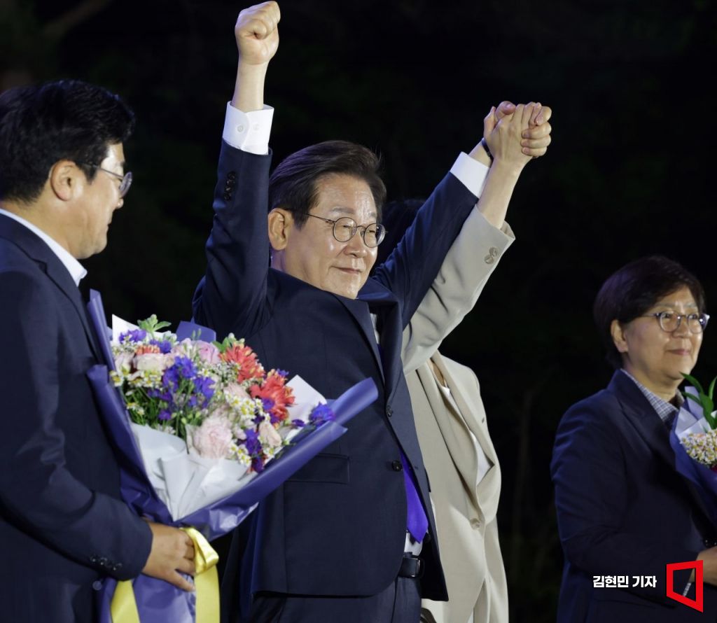 제21대 대통령 당선이 확실시되는 이재명 더불어민주당 대선 후보가 4일 서울 여의도 국회 앞에서 열린 국민 개표방송 행사에서 시민들을 향해 인사하고 있다. 김현민 기자
