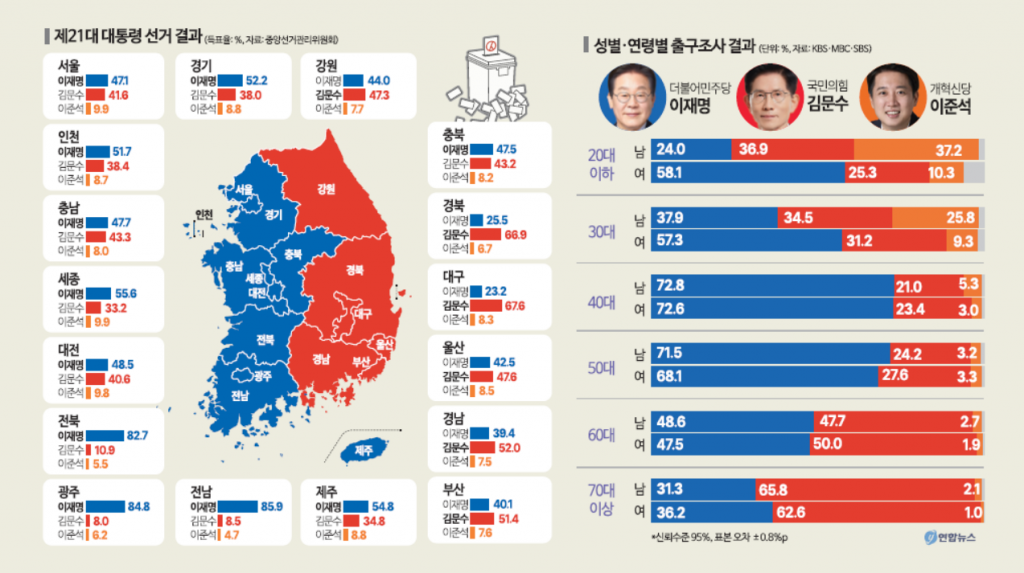 경기도지사 출신 정치인의 맞대결로 관심을 모았던 6·3 대선은 이재명 대통령 당선으로 마무리됐다. 최대 표밭인 경기도 승리를 토대로 인천은 물론이고 서울에서도 선전하면서 대선 승리를 견인했다. 다만 호남에서는 더불어민주당이, 영남에서는 국민의힘이 표를 독식하는 지역 구도 현상이 이번에도 반복됐다.