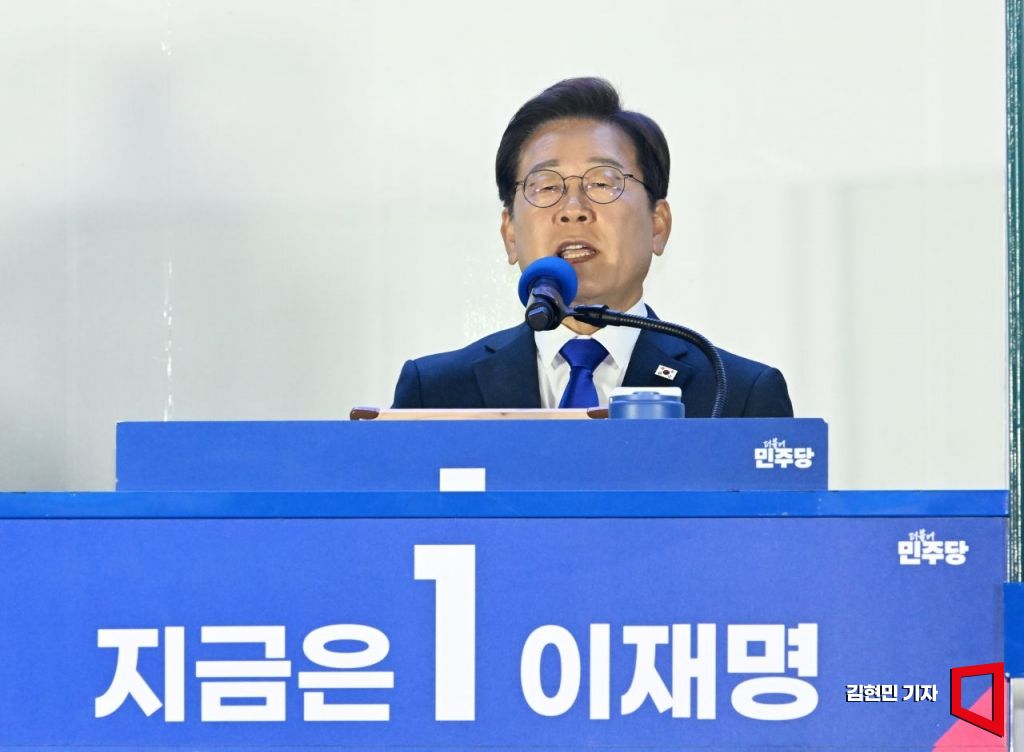제21대 대통령 당선이 확실시되는 이재명 더불어민주당 대선 후보가 4일 서울 여의도 국회 앞에서 열린 국민 개표방송 행사에서 연설하고 있다. 2025.6.4 김현민 기자