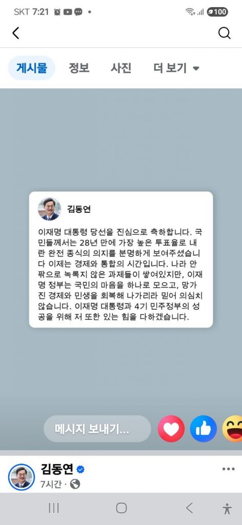 김동연 지사는 방송사의 이재명 후보 당선이 확실시되던 3일 자정께 자신의 사회관계망서비스(SNS)에 올린 글에서 "이재명 대통령 당선을 진심으로 축하한다"며 "국민들께서는 28년 만에 가장 높은 투표율로 내란 완전 종식의 의지를 분명하게 보여주셨다"고 했다.