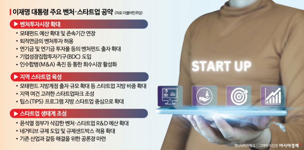 4일 이 대통령의 정책 공약집에 따르면 그는 벤처 시장 활성화를 위해 모태펀드의 존속 기간 연장과 출자 예산 확대를 약속했다. 지난 20년간 10조원 넘게 출자된 이 펀드의 예산을 지속적으로 확대해 '40조원 규모의 민간 벤처시장'을 조성하겠다는 구상이다. 여기에 퇴직연금·연기금 등의 여유자금을 모아 벤처투자에 유입시키는 공공금융 풀도 신설하겠다고 밝혔다.