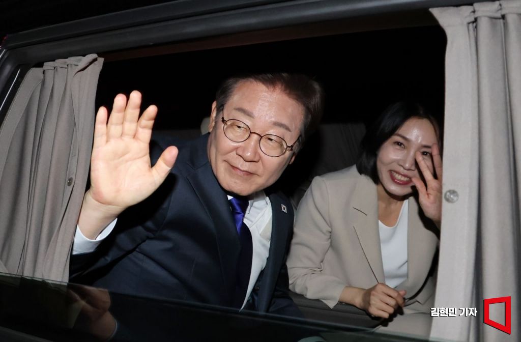이재명 더불어민주당 대선 후보와 김혜경 여사가 당선이 확실시된 4일 새벽 서울 여의도 국회 앞에서 열린 국민 개표방송 행사를 마친 뒤 차에 올라 인사하고 있다. 김현민 기자
