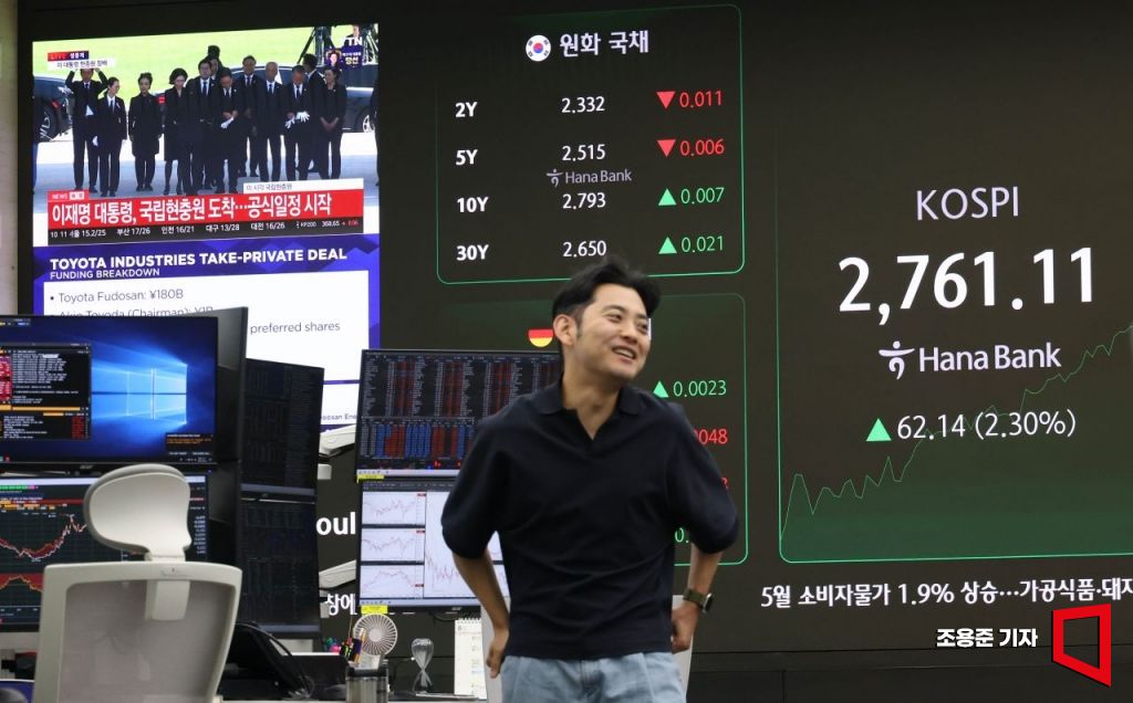 주가 5000시대를 열겠다고 공약한 이재명 후보가 대통령에 당선되면서 국내 증시가 2% 가까이 상승한 4일 서울 중구 하나은행 딜링룸 현황판에 이재명 대통령 관련 뉴스 등이 표시되고 있다. 이날 코스피 지수는 전 거래일 대비 38.95포인트(1.44%) 오른 2,737.92에, 코스닥은 8.84포인트(1.19%) 오른 749.13에 개장했다.