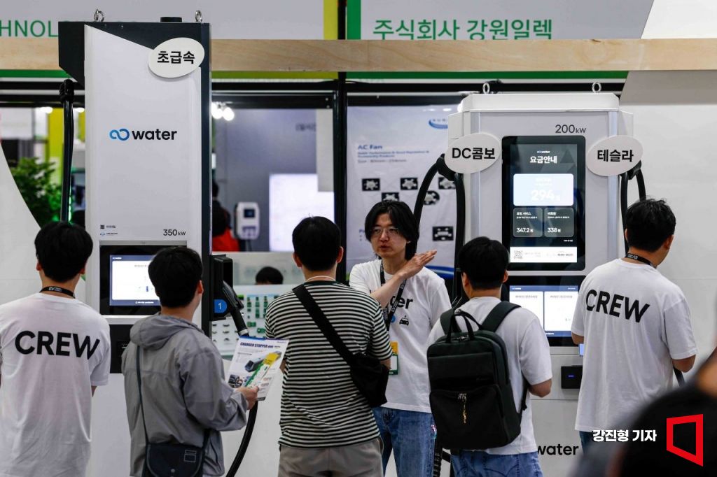 4일 서울 강남구 코엑스에서 열린 'EV트렌드코리아'에 참가한 관람객들이 전기차 충전기를 보고 있다.