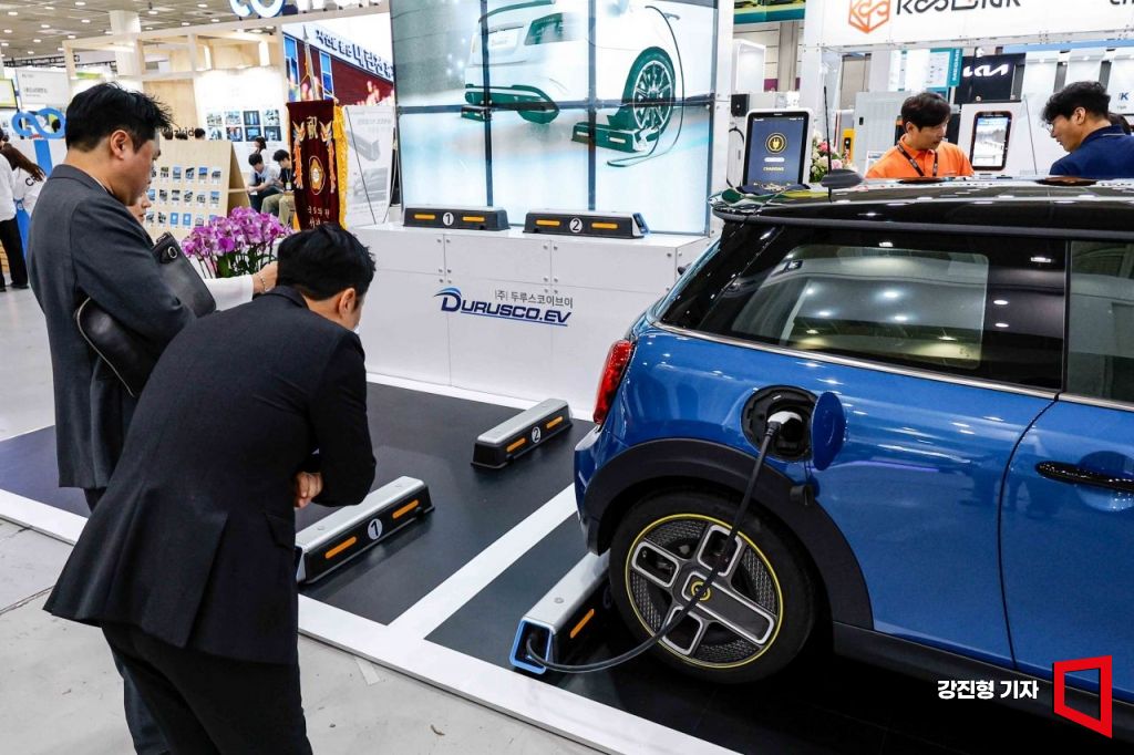 4일 서울 강남구 코엑스에서 열린 'EV트렌드코리아'에 참가한 관람객들이 카스토퍼 충전기 시연을 보고 있다.