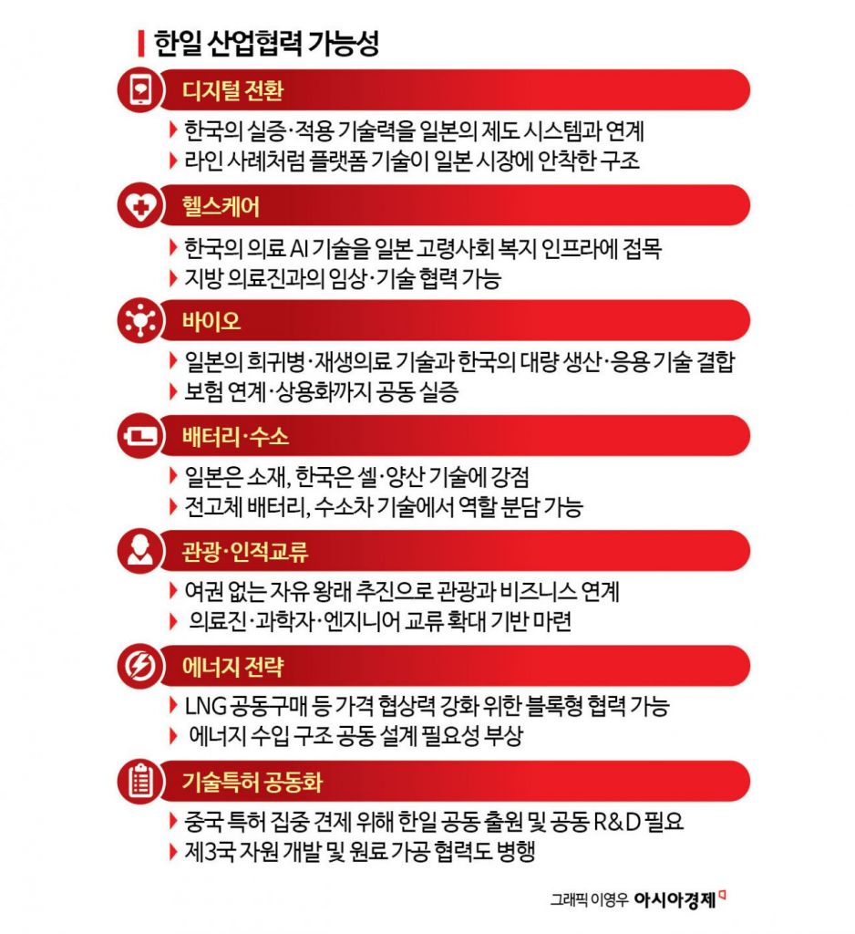한일 국교 정상화 60주년을 맞아 양국이 각자의 강점을 기반으로 분업과 협력을 통해 경제공동체를 구축해야 한다는 분석이 나온다. 일본의 국민 메신저로 자리 잡은 '라인'처럼 인공지능(AI) 및 디지털 전환 수요와 한국의 실증 역량을 연결한 기술 협력이 의료, 바이오, 에너지 등 실물 산업 전반으로 이어질 수 있을 것이라는 기대가 나온다.