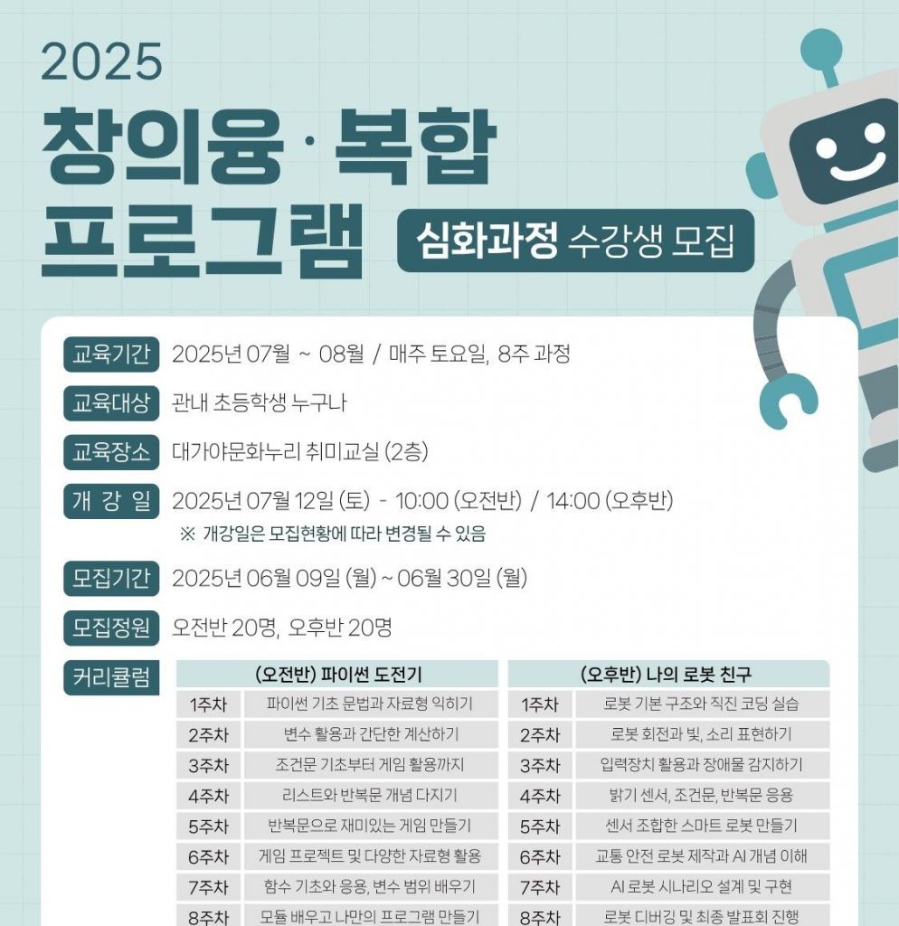 교육은 오는 7월 12일부터 8월 30일까지 매주 토요일 총 8주간 진행되며 오전반과 오후반으로 운영된다. 오전반 '파이썬 도전기'는 프로그래밍 언어인 파이썬의 기초 문법과 개념을 익히고 직접 프로그램을 제작하는 과정을 다룬다. 오후반 '나의 로봇 친구'는 로봇의 기본 구조 이해부터 코딩을 활용한 AI 로봇 시나리오 설계 및 구현까지 체계적인 실습 중심 수업으로 구성된다.