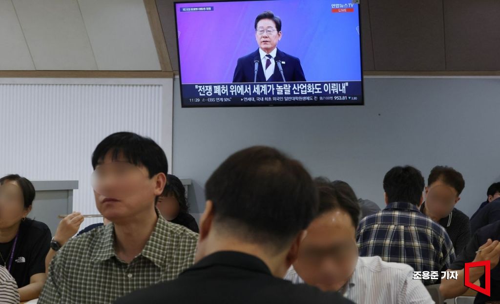 4일 서울 종로구 정부서울청사에서 직원들이 TV를 통해 이재명 대통령의 취임 선서식을 보고 있다.
