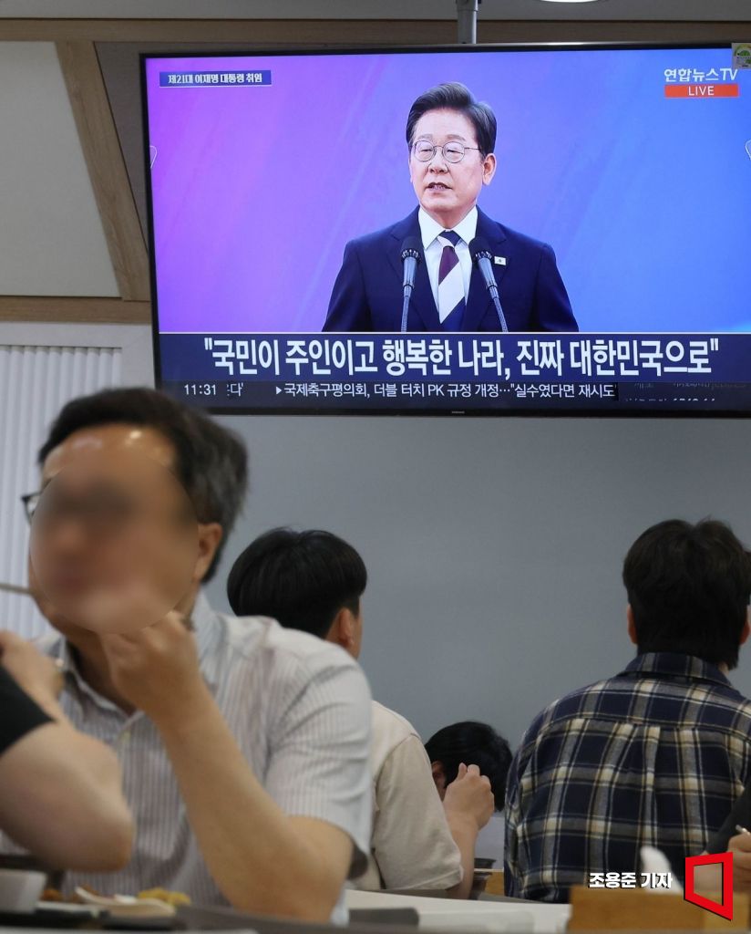 4일 서울 종로구 정부서울청사에서 직원들이 TV를 통해 이재명 대통령의 취임 선서식을 보고 있다.