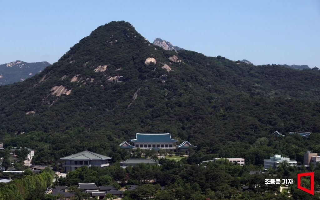 이재명 대통령이 집무실을 청와대로 이전할 예정인 가운데 청와대 개·보수 작업이 완료될 때까지는 당분간 용산 대통령실로 출근하게 된다. 윤석열 전 대통령이 2022년 5월 10일 대통령 집무실을 용산 국방부 청사로 공식 이전한 지 3년여 만에 '용산 시대'를 마감한다. 4일 이재명 대통령 취임날 서울 종로구에서 바라본 청와대 모습.