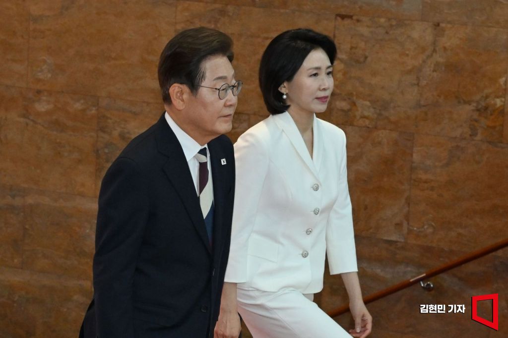 이재명 대통령과 김혜경 여사가 4일 서울 여의도 국회에서 열린 제21대 대통령 취임선서식에 참석하고 있다.