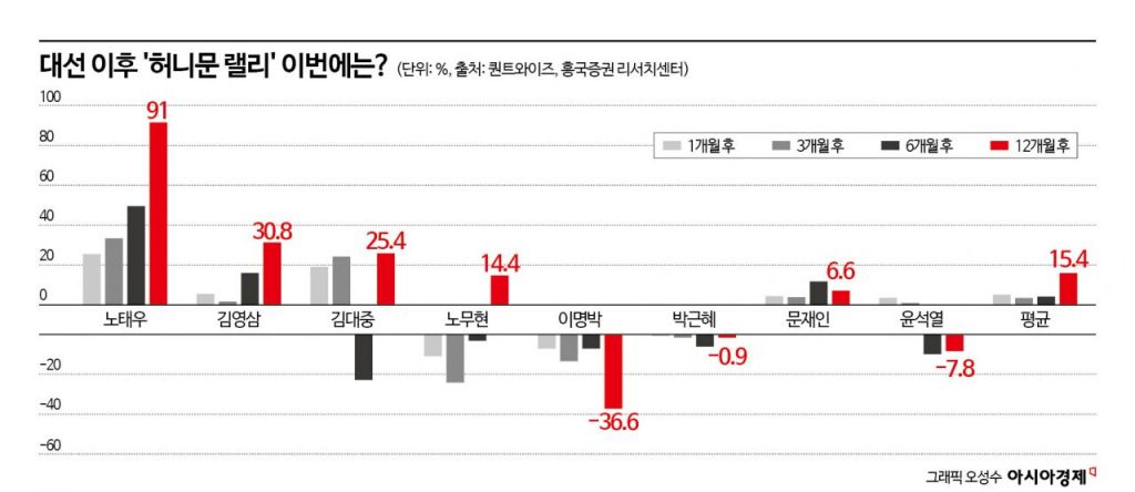 경험적 데이터도 낙관론을 뒷받침한다. 흥국증권 리서치센터에 따르면 직선제로 대통령을 선출한 1987년 이후 치러진 8번의 대선에서 코스피의 1개월 평균 상승률은 4.7%로 집계됐다. 대선 1년 후 코스피는 평균 15.4% 올랐다. 이재명 정부가 역대 정부 출발 시점과 비교해 상대적으로 매우 낮은 밸류에이션 수준에서 출발하는 만큼 이번에도 '허니문 랠리'(정권 초 증시 강세)를 기대볼 수 있다는 평가다.