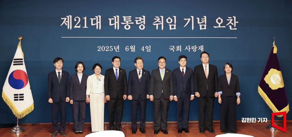 이재명 대통령이 4일 서울 여의도 국회 사랑재에서 우원식 국회의장이 준비한 제21대 대통령 취임 기념 오찬에 참석해 기념사진 촬영을 하고 있다. 왼쪽부터 한창민 사회민주당 대표, 김재연 진보당 대표, 김선민 조국혁신당 대표 권한대행, 박찬대 더불어민주당 원내대표, 이 대통령, 우 의장, 김용태 국민의힘 비대위원장, 천하람 대표 권한대행 겸 원내대표, 용혜인 기본소득당 대표.